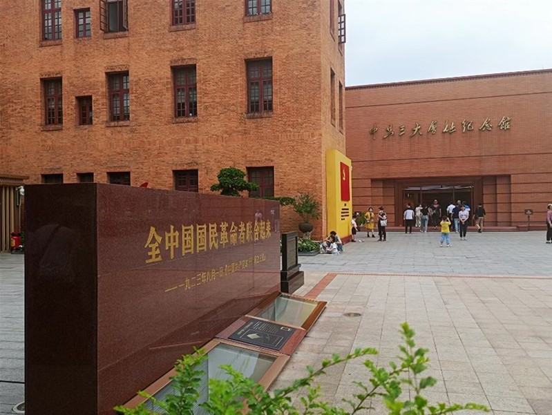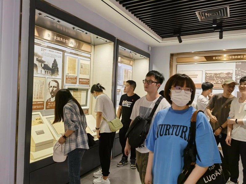 中共三大会址纪念馆由中共三大会址遗址广场、中共中央机关旧址——春园、中共三大历史陈列馆组成。党员同志及团员们怀着无比崇敬的心情走进中共三大会址纪念馆,参观“中国共产党第三次全国代表大会历史陈列”里“上下求索”“凝聚共识”“风起云涌”“理想之光”等四个单元。大家时而驻足凝视,时而相互交流,通过图展、文物、雕像、立体场景和全息影像等多种形式,沉浸式体验大会召开的历史背景、重要片段,从一个个党史故事和历史细节中学习革命先辈的崇高精神,感悟共产党人的初心使命,了解并掌握中共三大召开的复杂历史背景、重大历史意义和深远影响。