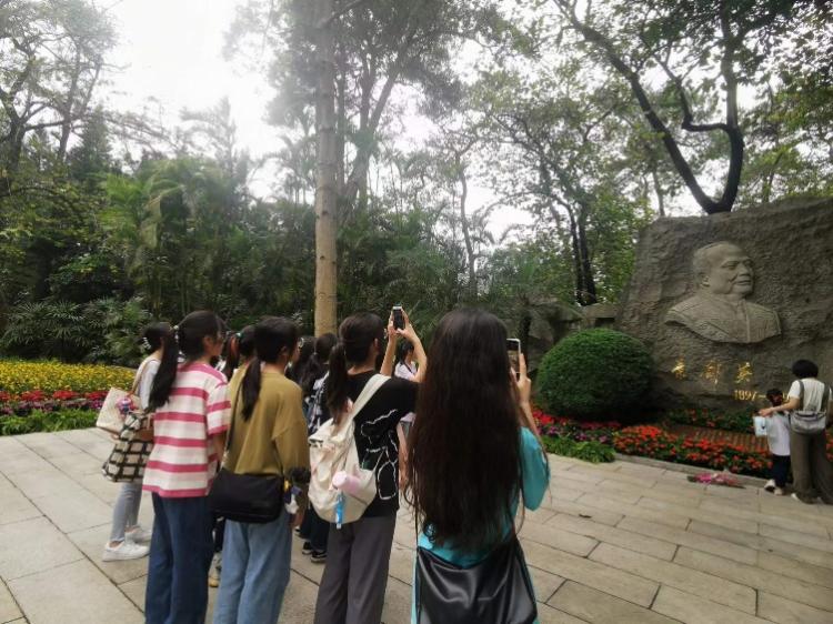 沿着宽阔的陵墓大道往前走,便看到高耸的广州起义纪念碑,上面有邓小平同志亲笔题写的“广州起义烈士永垂不朽”金色大字,下方有巨幅的浮雕,分别重现了广州起义的四个光辉历史时刻,也让人了解到广州起义的惊心动魄,以及先辈们奋勇抗争,舍生取义的不朽精神。在这雄伟建筑前,同志们一起在此进行合影留念,并面向肃穆的纪念碑深深默哀,三次鞠躬,以表对先烈的敬仰和追思。